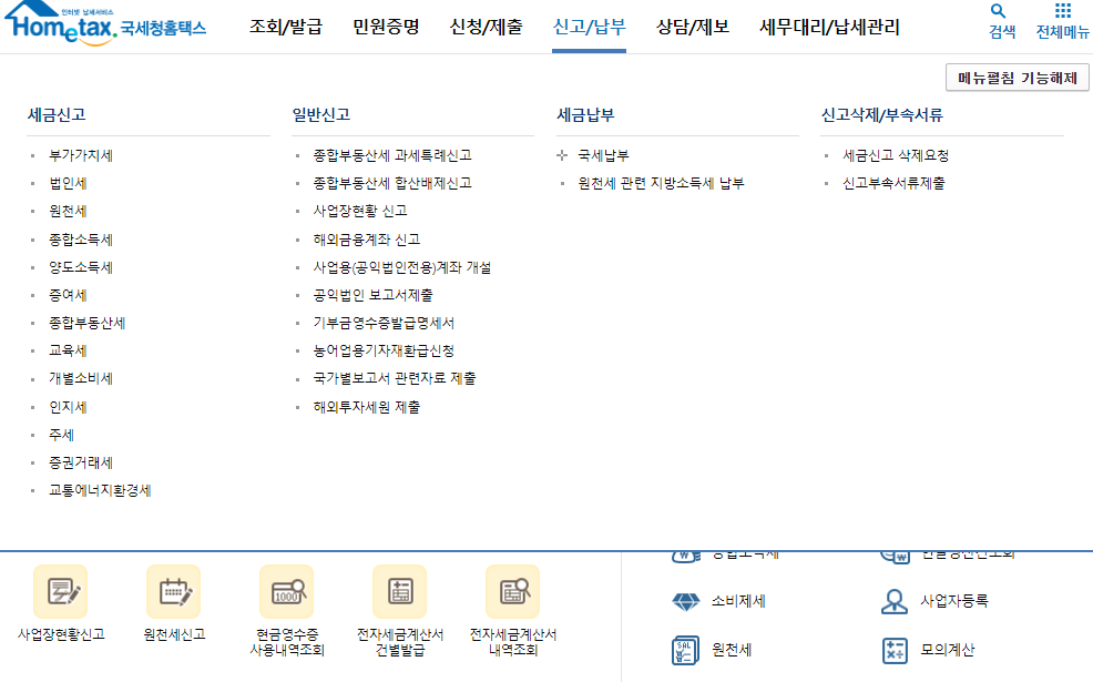 2) 상단 메뉴에 신고/납부