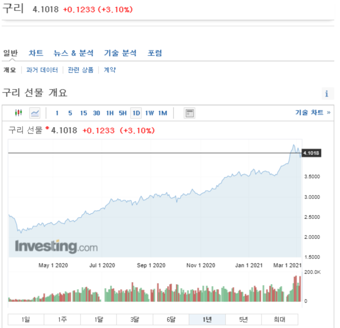 이를 확인하기 위해 최근 1년간 구리가격을 살펴보겠습니다.