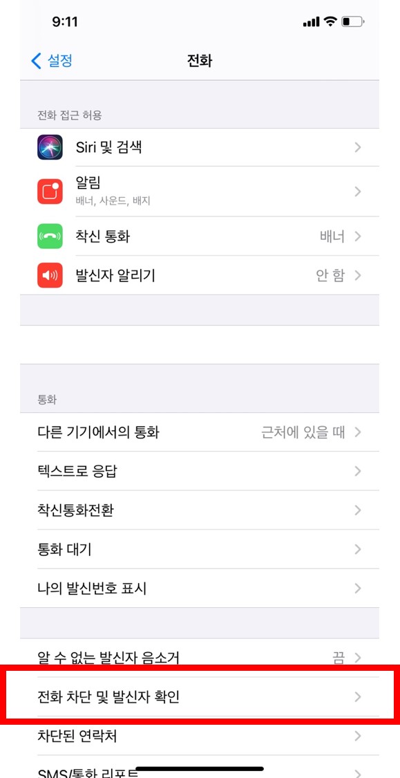 3. 전화 차단 및 발신자 확인을 터치해주세요. 아랫 부분에 위치하고 있습니다.