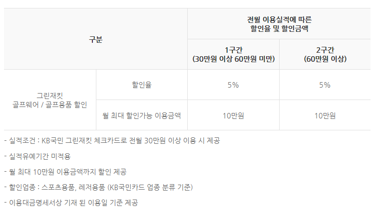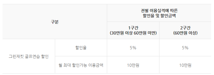 결론 : 월 30만 원 이상 사용해야 골프웨어, 골프용품 할인을 받을 수 있습니다.