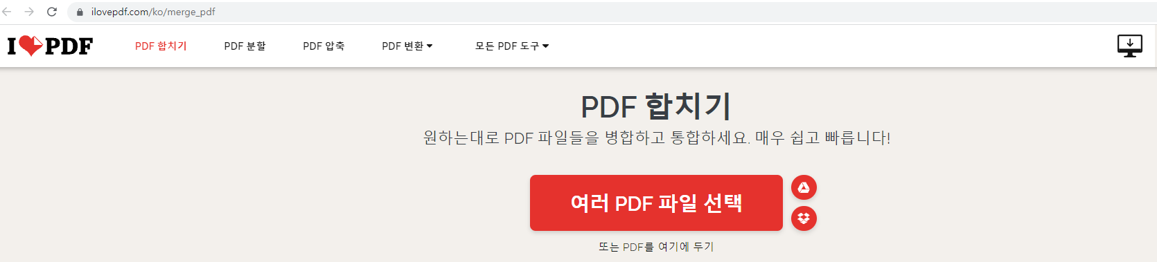 3) 중간에 빨간글씨로 보이는 여러 PDF 파일 선택을 클릭한 다음에 파일 합치기를 누르면 끝입니다. 정말 간단합니다.