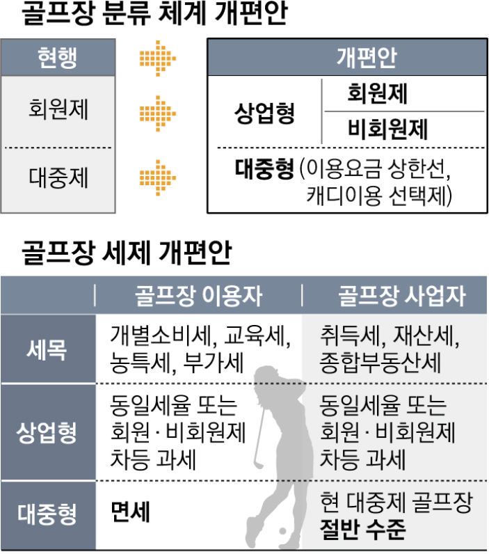 - 골프장 분류를 현재 회원제와 대중제에서 회원제 상업형 골프장, 비회원제 상업형 골프장, 대중형 골프장으로 분류