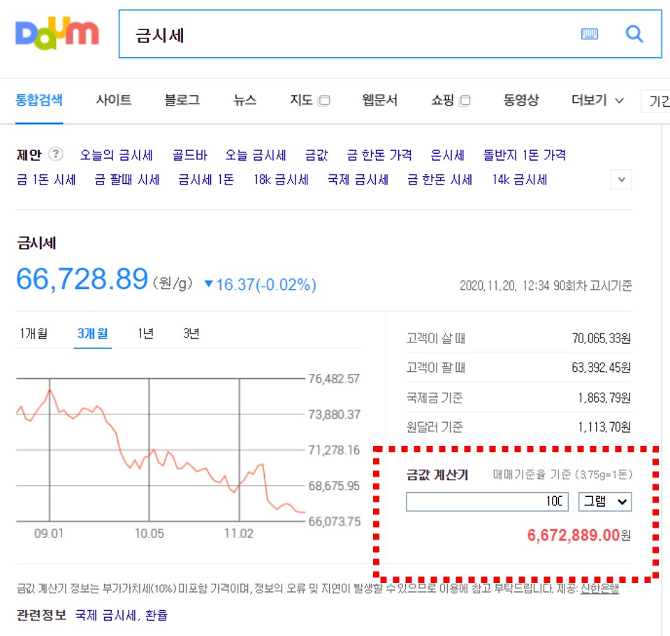 참고로 2020.11.20 기준 금 100g의 가격은 6,672,889원으로 형성되어 있습니다.