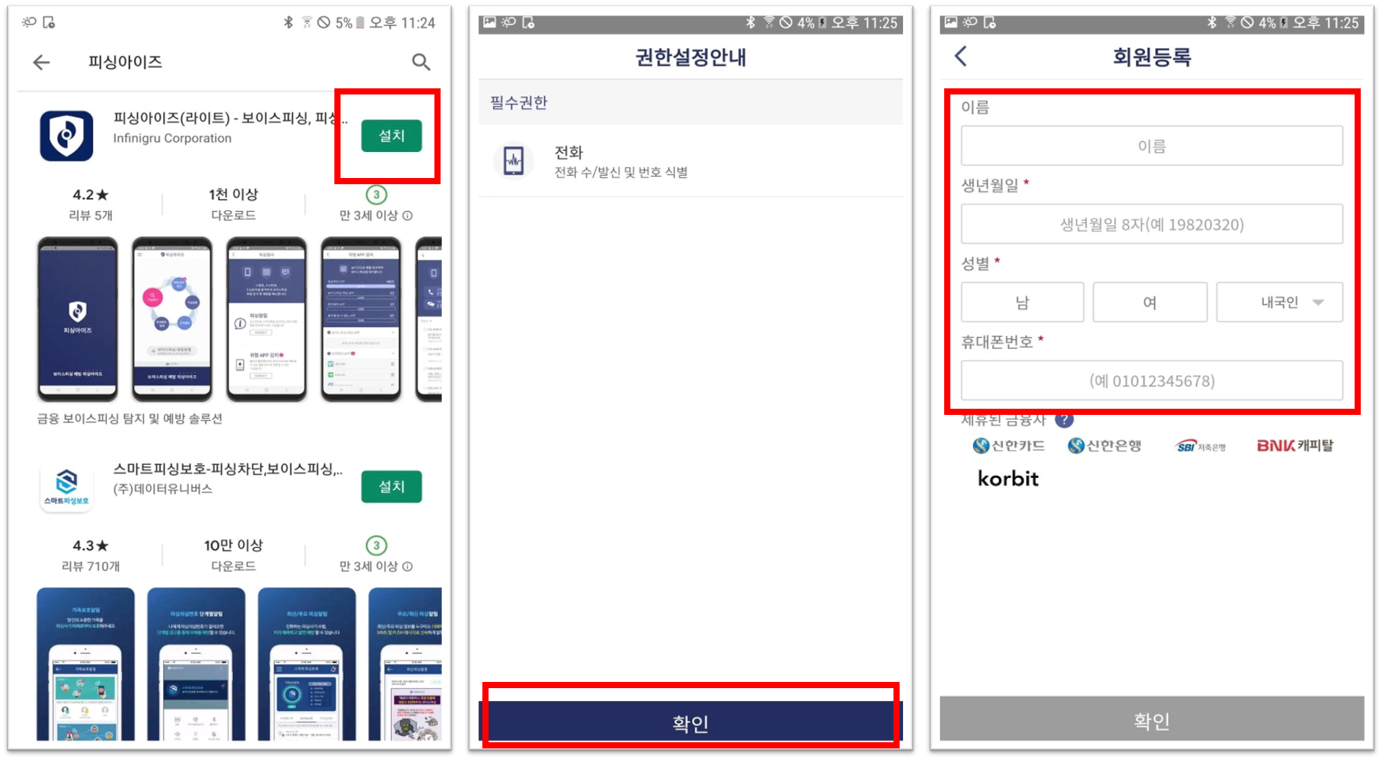 앱을 다운할 때는 본인의 전화 발신 및 수신 번호에 접근할 수 있는 동의가 필요하고 실명을 확인할 수 있는 정보를 입력해야지만 설치가 가능합니다.