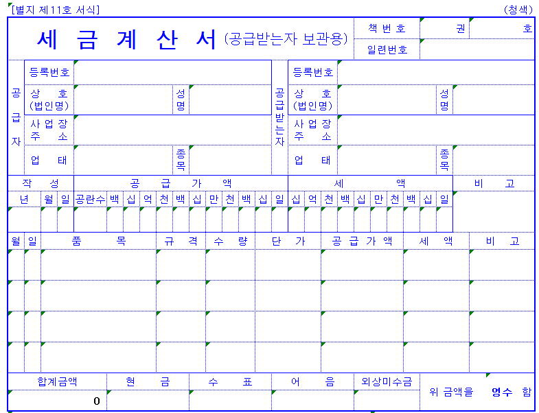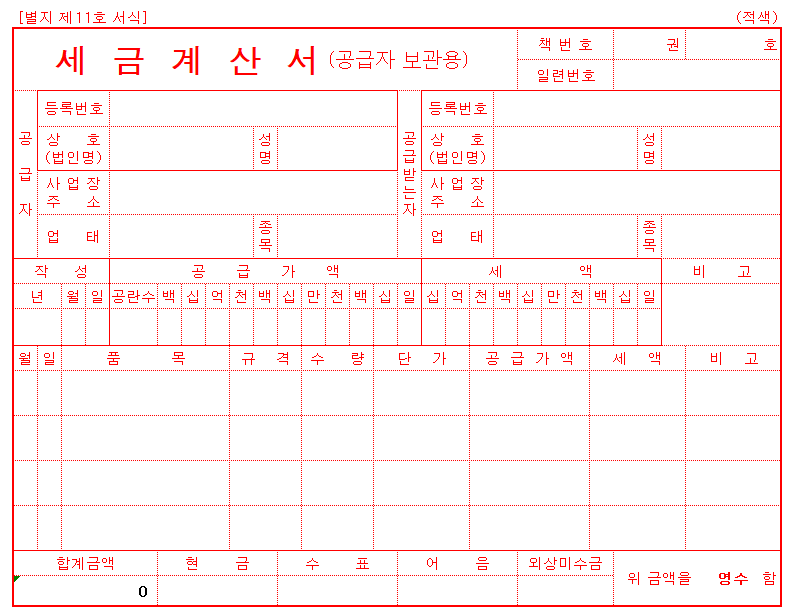 - 상호, 성명, 사업자 주소, 업태, 종목 등을 포함하여 공급자 정보
