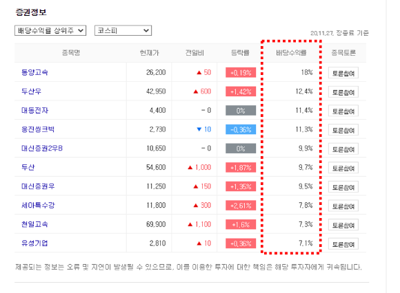 자. 그럼 배당을 하는 주식이 좋을까요? 아니면 배당을 하지 않는 주식이 좋을까요? 일반적으로 배당을 하는 주식을 더 선호합니다. 왜냐하면 시세차익과 더불어 배당 수익을 챙길 수 있기 때문입니다. 그러면 자연스럽게 배당금이 높은 주식에 관심이 갑니다. 다음 메인화면에서 배당주 순위로 검색하면 바로 결과를 찾을 수 있습니다.