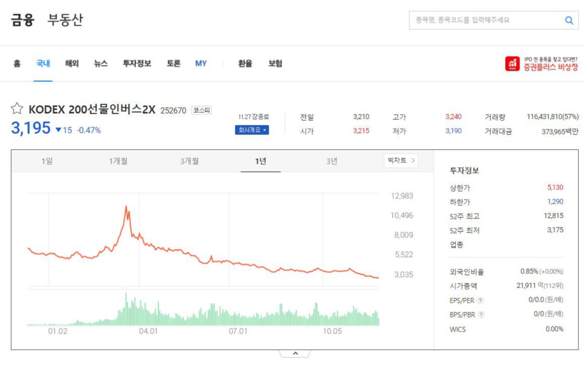 보이시나요? 3월에 최고 가격 12,815원을 찍은 뒤 현재는 3,100원대에 거래되고 있습니다. 연말을 앞둔 시점에서 배당투자에 대한 사람들의 기대심리가 높아지고 있고 기존 투자자들이 대세 상승 시장을 많이 예상하고 있는 상태여서 인버스에 투자한 분들은 편한 밤을 지내기 어려울 것 같습니다.