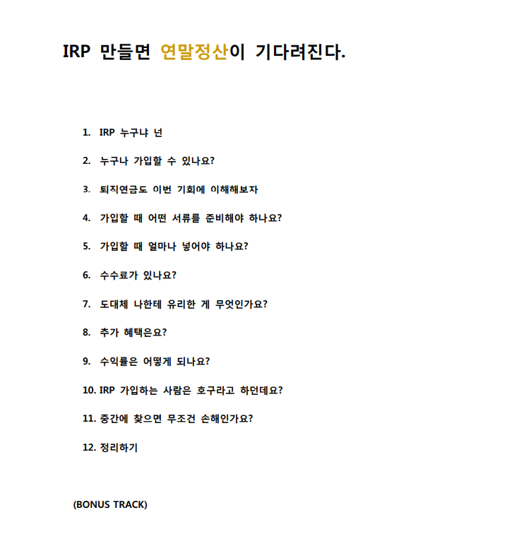 다시 생각해본 결과 그래도 남들보다 금융 쪽에 관심이 많이 것을 내세울만하다고 생각이 들었습니다. 그래서 제가 예전부터 가입한 IRP의 수익률이 나름 선방하고 있고 연말정산에 관한 니즈로 충족할 수 있다는 생각이 들어서 'IRP 만들면 연말정산이 기다려진다.'로 제목까지 최종 결정했습니다.